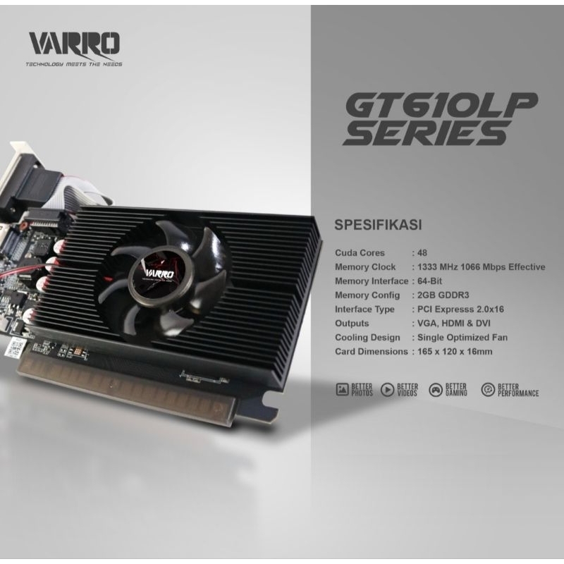 VGA VARRO GT610LP DDR3 2GB 64bit dengan garansi 1 tahun, cocok untuk penggunaan multimedia dan browsing.